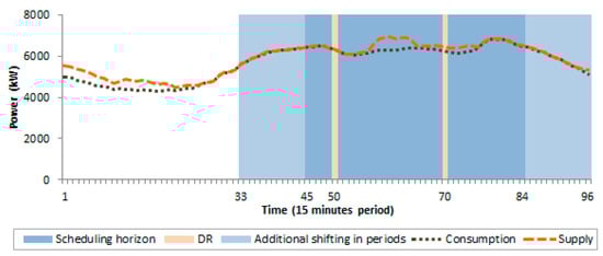Figure 3. A total of 96 periods of 15 min (24 h) have been considered. The scheduling horizon spans over 10 h (from period 45 to period 84).