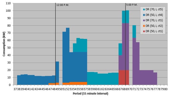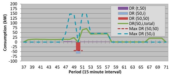 Figure 5 and other figures in the case study, the DR use is indicated from period t to period i, in cluster ct, when applicable. In this way, DR (t,50) refers to the consumption that is shifted from period t to period i=50; DR (50,50) refers to the consumption reduction in period 50. Finally, DR(50,i) refers to the consumption shifted from period 50 to period i.