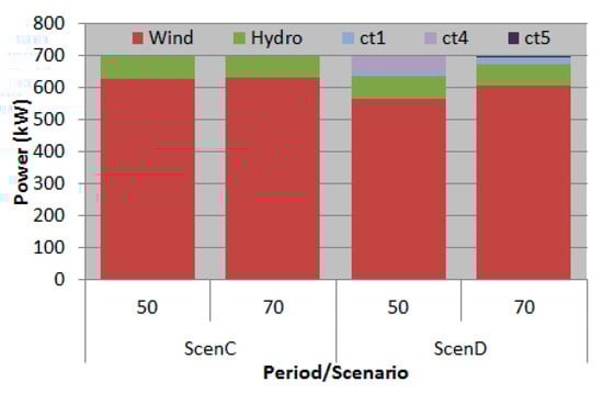 Figure 9 compares the resource scheduling for each DR event period for scenarios ScenC and ScenD. As ScenC only uses DG and ScenD uses DG and DR, these results allow making conclusions about the impact of the DR resources availability. In ScenC, all the available hydro DG is used while the wind DG is used as needed in order to reach the required 700 kW. In the case of ScenD, by introducing DR, one can see that the wind DG contribution is lower due to the use of DR for consumption clusters ct1, ct4, and ct5. In this way, the final cost has been significantly reduced.