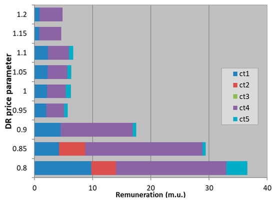 Figure 11. It can be seen that with the lowering of the DR price, increasing levels of DR are scheduled. Furthermore, for lower DR prices, ct2 is scheduled and for the highest DR prices, only ct1 and ct4 are scheduled. It is important to remember that the remuneration of the resources is linearly depending on the respective price; however, according to