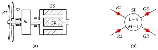 Counter-rotating wind turbine with counter-rotating electric generator: (a) general conceptual scheme; (b) block scheme of the speed increaser (SI) with two inputs and two outputs (R1—main wind rotor, R2—secondary wind rotor, GR—electric generator rotor, GS—electric generator stator, L—number of mechanism inputs and outputs, M—mechanism degree of freedom).