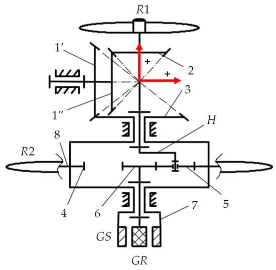 Considering the general case illustrated in Figure 1, the paper highlights the performance and features of this new type of WTs through an example that integrates a new planetary speed increaser (Figure 2), which is subject to patent application. This speed increaser is obtained by linking in parallel a bevel transmission with fixed axes 2–1”−1’−3 (denoted by I, Figure 3) and a 2 DOF planetary spur gear set with one satellite gear 4-5-6-H (denoted by II). The bevel gear 3 transmits the motion to the sun ring gear 4, which is connected to the generator stator GS, while the carrier H takes the motion from the main wind rotor R1. The secondary wind rotor R2 drives the ring gear 4 and, thus, the stator GS. The shaft of the rotor GR is connected to the shaft of the sun gear 6 in the planetary gear set II.
