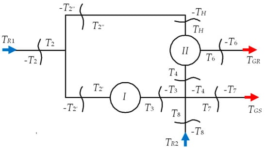 - Case 1: the torque of the secondary wind rotor is null , i.e., , Figure 6a and Figure 7a. This situation occurs when the secondary wind turbine is set so as not to generate mechanical power, the gearbox thus running with one input and two outputs at the efficiency value , in case of considering friction (Figure 7a);