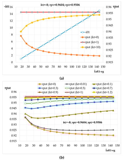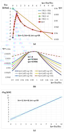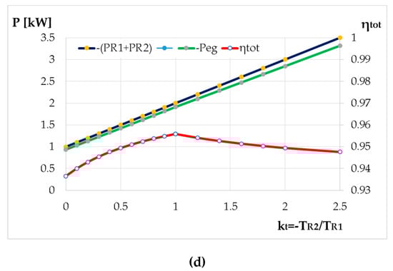 - the efficiency does not depend on the ratio in the case kt = 1, i.e., the input torques TR1 and TR2 are equal in absolute value, the efficiency being at its maximum value , Figure 4a,b;