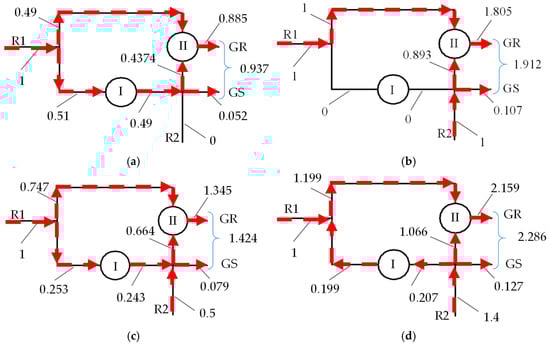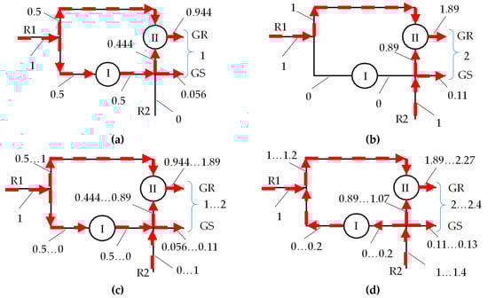 Based on the previous correlations, the kinematic and static modeling of the proposed planetary gearbox (Figure 2) is further presented, along with the power flow and efficiency analysis for four functioning cases of the speed increaser, defined according to the input torques ratio: (a) , (b) (c) , (d) . The torque generated by a wind rotor can be controlled by adjusting the pitch angle of the blades, which is considered in the paper through the adjustable parameter .