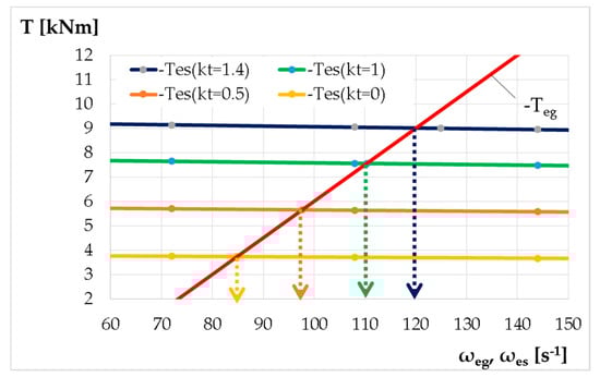 Graphical determination of the running point parameters on the equivalent output shaft for the four analyzed cases (kt = 0; 0.5; 1; 1.4).