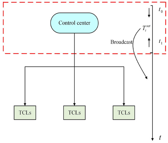 TCLs are used to provide frequency regulation services to the smart grid and are divided into M groups. Two major goals are proposed: (a) minimization of dissatisfaction, and (b) minimization of error in tracking the AGC signal. Three models are proposed considering comfort constraints and power constraints from three different aspects. The optimized control structure is shown in Figure 4. Within a period t, from to , the optimal temperature setpoint is calculated, and the control center generates a command, which is broadcasted to the TCLs. TCLS adjust their temperature settings according to the commands.