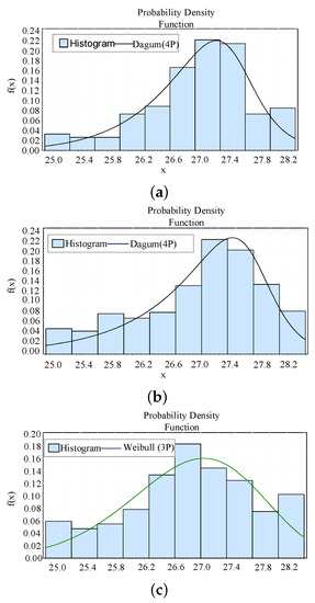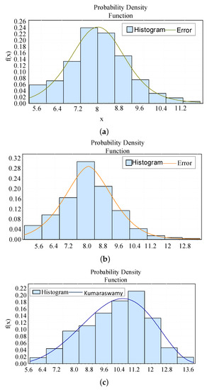 where = 3.2268, = 4.4536, a = 4.4694, and b = 14.879 are the distribution parameters. The probability density function is shown in Figure 7c.