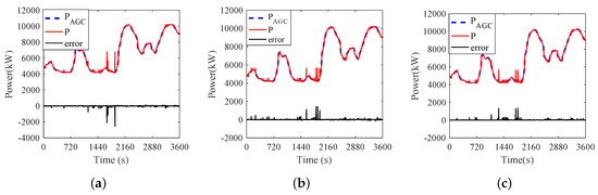 For the AGC signal with 900 steps, the switching times of 3000 TCLs under the three schemes are 168, 179, and 158, respectively. On average, the TCL is turned on or off every 5–6 steps. If the time interval between two steps is extended to 60 s, the TCL will be switched 10 times in one hour. In practice, the number of TCLs is larger than 3000. To reduce the switching time of the TCL, we can divide the TCLs into different groups. For example, we divide 60000 TCLs into 20 groups, and each group has 3000 TCLs. In every two-hour schedule, only one group is used. In this way, we can reduce the switching time to one in two hours. It can be seen from Figure 10 that the temperature variables are within the temperature limit. Similarly, Figure 11 shows the tracking performance of the three schemes. It can be seen from Figure 11 that the three schemes can provide promising load tracking services. But the large error in the graph is existed, it is users being picky about comfort that forces a sacrifice in the error to meet their needs. All in all, the load tracking service is still acceptable, which proves that the three schemes are established and reliable. In addition, comparing previous results in Table 4, it is observed that the value of the RMSE is reduced by applying these proposed control strategies.