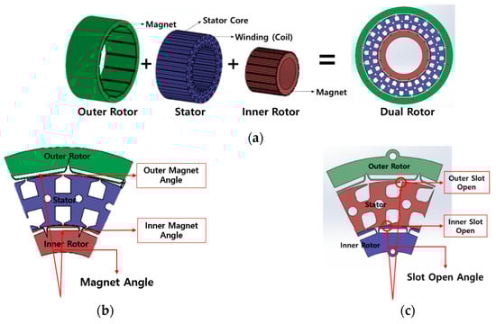 Dual rotor structure and cogging torque reduction method: (a) Dual rotor structure, (b) cogging torque reduction method according to magnet angle, (c) cogging torque reduction method based on adjustment of dual rotor slot opening angle.