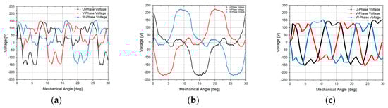 It can be seen in Figure 2a,c that the back EMF waveforms with the 8-pole 12-slot and 24-pole 36-slot combinations were irregular whereas the back EMF waveform with the 16-pole 24-slot combination, shown in Figure 1b, was sinusoidal.