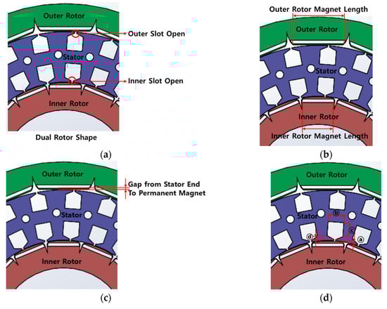 Electromagnetic field analysis was performed through “JMAG” (Ver. 14.1) and the characteristics of the cogging torque were derived in order to perform a comparative analysis. The data values were compared using electromagnetic field software keeping one parameter fixed at a time. Figure 3 examines the method used to reduce the cogging torque by modifying the stator and rotor geometries. The four general methods were analyzed similar to the proposed method. The dual rotor IPM motor had outer and inner slots of the stator and Figure 3a depicts how the optimal design value was derived by adjusting the lengths of the outer and inner slot openings. Figure 3b shows the comparison of the cogging torques by changing the lengths of the permanent magnets in the outer and inner rotors. Figure 3c shows the analysis of the output and cogging torque by changing the distance between the magnet and the stator tip. The output and cogging torque have a close linear relationship with the distance between the magnet and the stator. Figure 3d shows the derivation of the design value at which the cogging torque was the lowest by modifying the detailed design values of the inner stators. The cogging torque optimization method was proposed based on the four analysis methods in Figure 3.