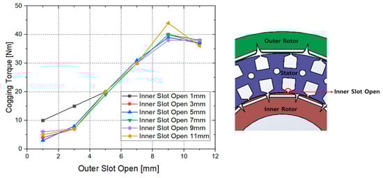 The cogging torque was analyzed at the rated velocity of 2200 rpm by adjusting the stator slot opening. An analysis of the graph in Figure 4 reveals the decreasing trend of the cogging torque as the slot opening became smaller. As shown on Figure 4, the cogging torque of the inner rotor was 3 Nm when the slot opening was 1 mm and 36 Nm when the slot opening was 11 mm, which was a difference of 33 Nm.