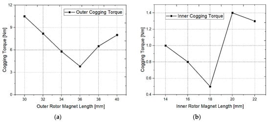 Analysis of cogging torque according to the dual rotor magnet length. (a) Change in permanent magnet length of outer rotor; (b) Change in permanent magnet length of inner rotor.