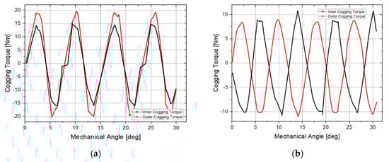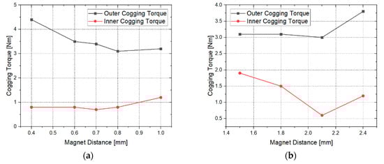 Cogging torque according to the distance between magnet and stator of dual rotor. (a) Distance between magnet and stator of outer rotor; (b) Distance between magnet and stator of inner rotor.
