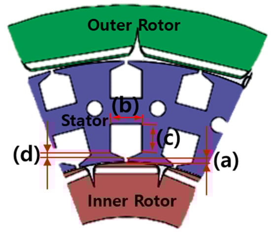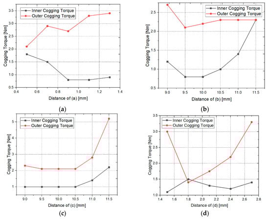 The distances of four different spots, named (a) to (d), were adopted in this study to optimize the stator shape, and they are shown in Figure 7. In distance of (a) shown in Figure 8a, the inner and outer slot lengths of the stator were changed to the same value, which resulted in the inner cogging torque of 0.8 Nm and the outer cogging torque of 2.7 Nm at a distance of 0.9 mm. The lowest cogging torque was obtained when these two cogging torque values were added together. The lowest inner cogging torque was obtained at a distance of 0.5 mm and the lowest outer cogging torque was obtained at a distance of 0.9 mm.