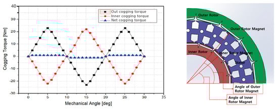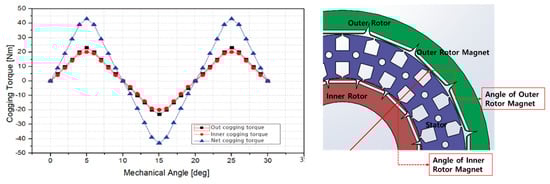 Figure 9 illustrates the core functionality of this paper, which was the method for reducing the cogging torque by applying an angle difference between the outer and inner magnets. Furthermore, the optimal angle was determined through an experiment that offset the cogging torques by varying the angles of the slot opening centers of the outer and inner rotors based on the detailed structure design according to the shape dimensions.