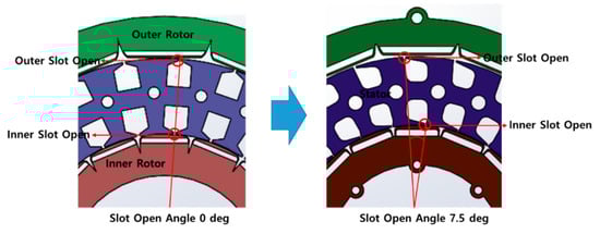 Figure 11 shows how to adjustment of stator slot opening angle. The method to show the cogging cancellation by changing the angle between the slot opening centers of the outer and inner rotors was verified by electromagnetic field analysis. In the case of ∠0°, cogging cancellation did not occur, similar to the case where only the slot opening was adjusted; however, cogging cancellation occurred when the angle was varied, and it was possible to derive the cogging cancellation waveform ideally at ∠7.5°.