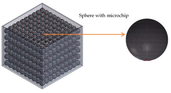 Figure 2 represents a sphere composed of two materials with a microchip embedded. The materials considered for the microchip were Si and SS316. The shape of the microchip was considered as solid parallelepiped, neglecting the channels in it to control the charge and discharge of the sphere, (0.5 × 0.5 × 2.5 mm). The strength calculations of the spheres did not take into account the microchip.