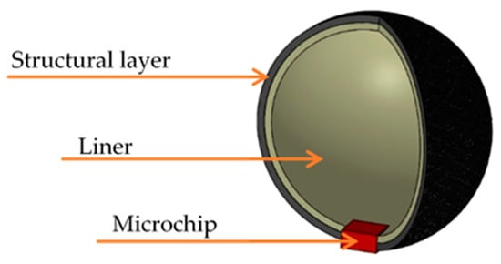 These considerations also suggest the study of spheres made of two materials, i.e., two concentric spherical layers: The inner layer, called the liner, to provide resistance to the permeation of hydrogen and, accordingly, Al5050-H38 was adopted for this layer; the outer layer, called the structural layer, to provide strength, and so CFEP was adopted. The materials considered for the microchip were either Si or SS316, because they are both already used in small electronic devices owing to their easy tooling capacities [16].