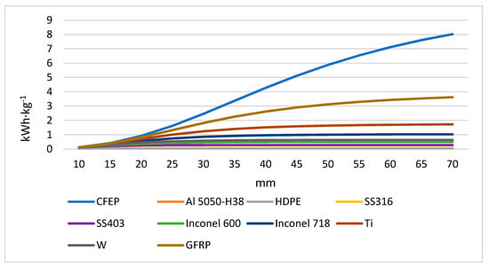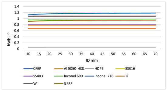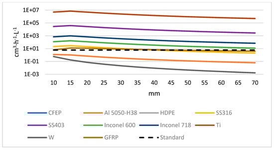 From Table 4, it follows that the metallic alloys (Al 5050-H38, SS316, SS403, Inconel 600, Inconel 718, Ti, W) have lower values of permeation, but higher values of strength than the polymeric materials (high-density polyethylene, HDPE). Besides, the composite materials (carbon fiber epoxy, CFEP; glass fiber reinforced polymer, GFRP) have higher values of permeation and either equal or higher values of strength than the metallic alloys.