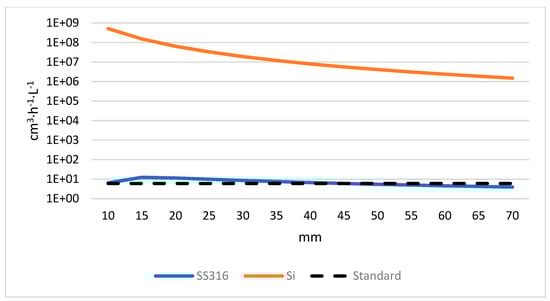 The EU 406 regulation [38] concerns the technical approval of vehicles fueled by hydrogen contained within metallic or non-metallic reservoirs. The permeation flowrate can be neglected for metallic reservoirs (type 1, 2, and 3). Reservoirs made of polymeric materials (type 4) must be subjected to permeation tests. In fact, polymeric materials have much higher permeability than metallic materials [39]. Moreover, the same regulation allows a maximum permeation flowrate of 6 Ncm3 h−1 L−1 (NPT) per liter of inner volume of the reservoir at steady state. This value is proposed in order to prevent inflammable mixtures of hydrogen and air in spaces, such as garages, for example, assuming the minimum air renovations per hour as 0.03 [40].