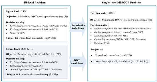 As formulated in previous section, and are DSO’s and MGOs’ decision variables, respectively. The amount of exchanged power between DSO and MGs plays an important role in the solution process, which couples the two levels through interactions among players. The proposed bi-level framework cannot be directly implemented in commercial solvers. To resolve this, by adding the KKT conditions of each follower problem, the lower-level problem (27)–(55) is converted into a single-level optimization problem. To solve the resulted single-level MISOCP problem by DSO, DSO has thorough knowledge of the required information pertaining to the MGs. Figure 3 briefly represents the decision-making process outlining the objectives, constraints of the bi-level problem and its transformation into a corresponding single-level MISOCP problem through KKT optimality conditions of the lower-level. The Lagrangian function and related derived KKT conditions of the lower-level problem can be calculated by (A1)–(A36) which are given in Appendix A. In this regard, the collection of non-equality constraints of the lower-level problem are rewritten as greater than or equal to zero constraints. Likewise, all equality constraints of the lower-level problem are rewritten as equal to zero constraints. Indeed, the resulted MISOCP problem is nonlinear because of the complimentary conditions from applying KKTs. To this end, the strong duality theorem is used in Appendix A to linearize the resulted MISOCP problem.