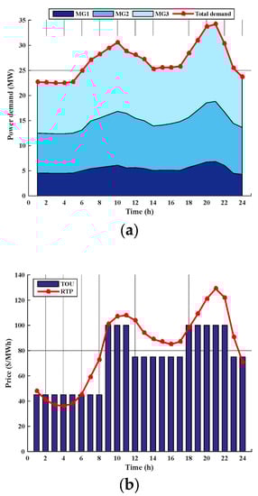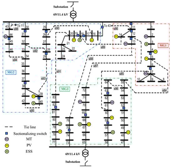In this paper, the 84-bus 11.4 kV Taiwan power company distribution system [29], as shown in Figure 4, is considered as the test system. This system has three MGs which are interconnected through 13 tie lines. Moreover, it includes 11 feeders and 20 sectionalizing switches. It is assumed that similar type and size of MTs, PVs and ESSs are utilized in MGs with a sitting layout illustrated in Figure 4. All characteristics of DERs and other values for technical parameters are depicted in Table 1 [29]. The predicted values for PV output powers can be extracted from [30]. The support areas of DR programs for the corresponding MGs and their bid-quantity offer packages [31] are provided in Table 2 and Table 3, respectively. The forecasted hourly load profile of each MG is shown in Figure 5a, while Figure 5b represents the forecasted Real Time Pricing (RTP) of the wholesale market and the retail market prices based on Time-of-Use (TOU) scheme [29].
