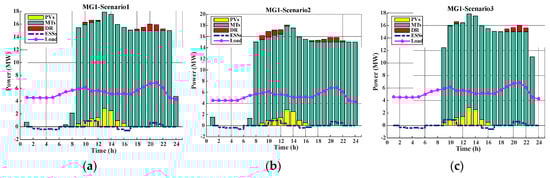 Hourly operation scheduling of the MTs, DR programs and ESSs in MG1 for CS1: (a) scenario 1; (b) scenario 2; (c) scenario 3.