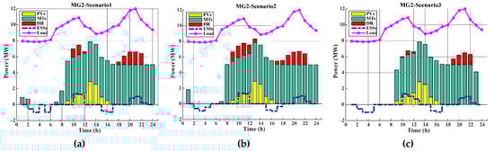 Hourly operation scheduling of the MTs, DR programs and ESSs in MG2 for CS1: (a) scenario 1; (b) scenario 2; (c) scenario 3.