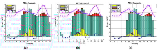 Hourly operation scheduling of the MTs, DR programs and ESSs in MG3 for CS1: (a) scenario 1; (b) scenario 2; (c) scenario 3.