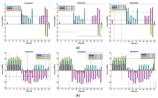 Exchanged power in different scenarios for CS1: (a) among MGs; (b) between DSO and MGs.