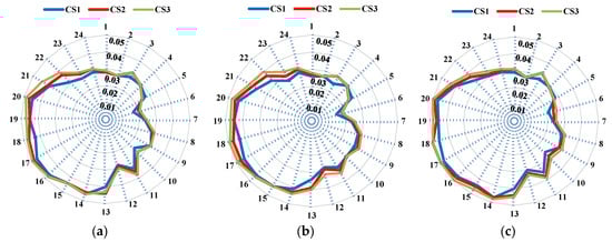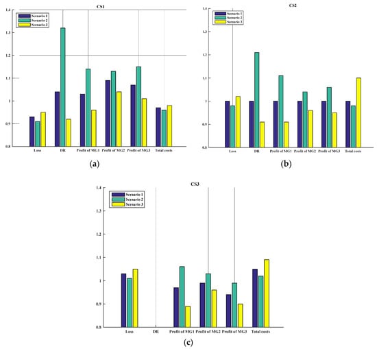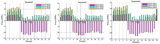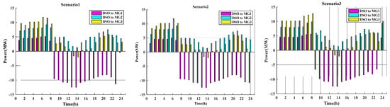 Exchanged power between DSO and MGs in different scenarios for CS2: (a) scenario 1; (b) scenario 2; (c) scenario 3.