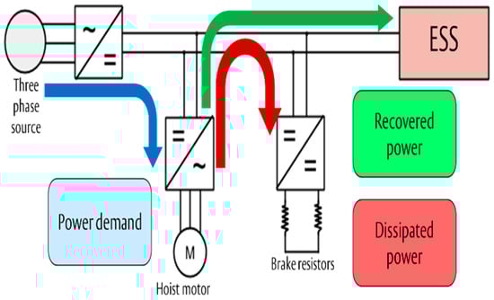 The power which is fed into the RTG crane system is rectified through a diode converter, which converts alternating current (AC) into direct current (DC) power but only allows unidirectional flow, as seen in Figure 2. This process aims to protect the electrical distribution side from voltage mismatches or high harmonics produced from the regeneration due to electrical braking in the hoist and trolley motors. The DC power is delivered through a DC bus to the RTG motors through a voltage source converter (VSC) [13,14]. Thus, while lowering the container, the hoist motor works under generating conditions with the generated power passing to the DC link which increases the DC voltage level. Typically, in an RTG crane system, if the DC voltage reaches 750 V, a brake chopper is activated allowing excess energy to be dissipated through a set of brake resistors. To absorb the excess energy produced during the lowering of the container, an energy storage system can be attached to the DC bus, whose energy can then be used to help lift the next container. In the literature, the ESS solution in RTG cranes is mainly focused and used to save energy on a single RTG system [5,8].