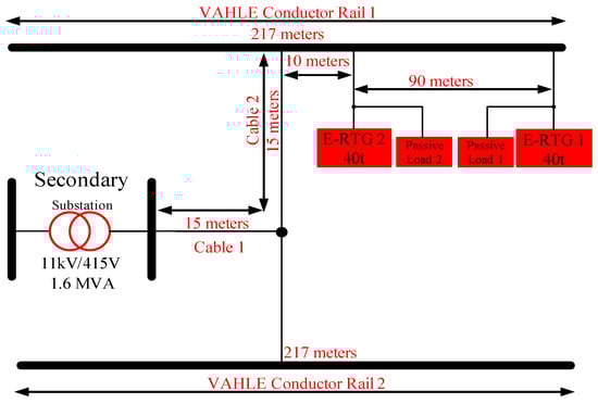 - Primary substation: is an ideal three-phase source for the RTG crane system. The feeder substation (11 kV/ 415 V) provides the necessary power through a low voltage cable which supplies 415V to two cranes via a conductor rail bar. The key numerical parameters of the electrical network components are presented in Table 2 [7]. The parameters of the RTGs network (Section 2.3, Table 2) have been validated using data collected at the Port of Felixstowe, UK.