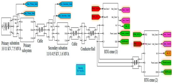 The cranes network, including the electrical distribution network and RTG crane elements, has been developed in MATLAB/Simulink. The network of cranes model, as seen in Figure 4, consists of three main components as follows: