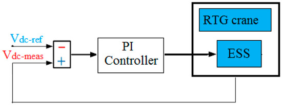 In a standard RTG crane, if the DC voltage level exceeds the voltage threshold (750 V) during the lowering phase, the brake chopper is activated which enables the regenerated energy to be dissipated as heat and reduces the DC voltage level in the DC link. With the incorporation of the ESS, its control system is assumed active at 625 V [5]. In this study, the set-point system charge and discharge of the ESS is based on the comparison between the reference DC voltage (Vdc-ref), equal to 625V and the measured voltage value of the DC link (Vdc-meas). When the DC voltage is equal to the set point (625 V), the charging mode of the ESS is activated and then the DC voltage is lower than 600, the ESS is in discharging mode [6]. The PI control system aims to charge the ESS during DC voltage variation by setting a reference voltage [5,6]. The PI controller, as shown in Figure 5, generates a control signal to charge or discharge ESS depending on where the crane is in its duty cycle.