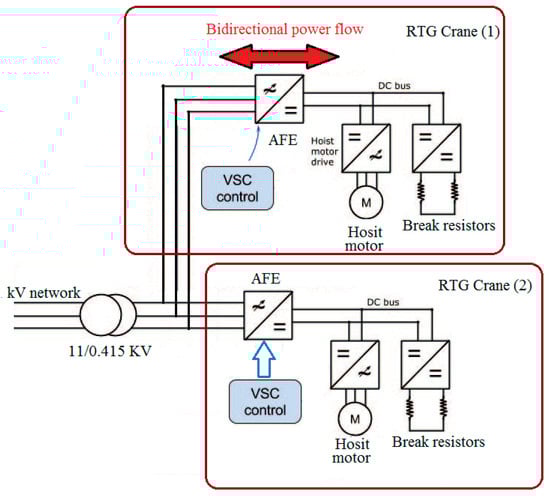 - A network of two RTG cranes with each AFE system rated 150 kW (no ESS). The AFE allows the regenerated power to be fed back into the electrical network of the port terminal by two VSC converters working in four power quadrants [13,14].