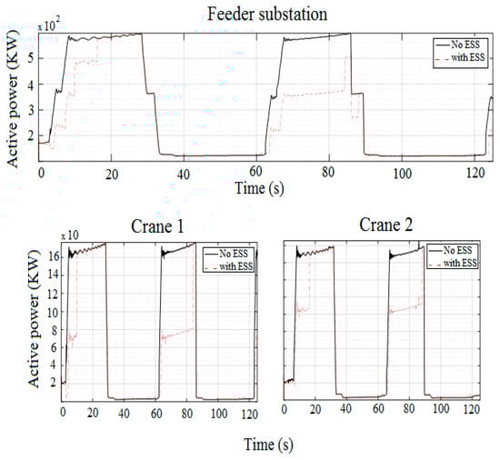 It is clear that the ESS helps to reduce the energy consumption by 30%, compared to no ESS model, during the both lifting periods by minimising the area of the peak power curve. The reduction in the energy consumption and peak demand in the feeder substation and on both RTG cranes can be clearly seen in the second peak period from 62 s to 92 s (the second lifting period) compared to the first lifting period (from 2 s to 32 s) due to the ESS being not fully charged during the first lifting period. The ESS uses the recovered energy during the lowering mode of the first cycle (32 s to 60 s) to charge the ESS (fully charged) before starting the second lifting mode, which helps to decrease the peak demand and increase the energy savings. In Figure 7, the differences in the active power between the substation and cranes system is mainly related to the power network and converters losses.