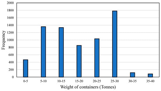 A histogram of the weight of containers for data collected at Port of Felixstowe over a period of four months.