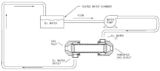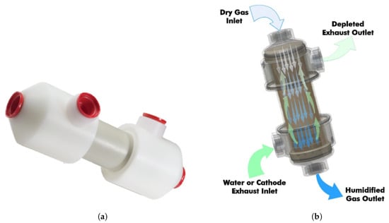 Nafion® is a material widely used in FC membranes; however, this paper studies a particular application of the material, Nafion® tubing. Nafion® tubing is a shell and tube moisture exchanger that allows water vapor transfer []. The setup of such humidifiers can be both water-to-gas or gas-to-gas. The molecules of water are absorbed into the Nafion® tube walls and conveyed to dry gas flow.