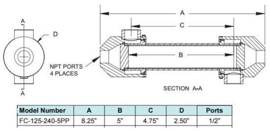 More in detail, it is possible to appreciate the internal details of the specific component in Figure 2. The middle cylindrical zone (around the ‘B’ dimension) is dedicated to the water exchange, where a thin layer of the Nafion is applied between the two flows.