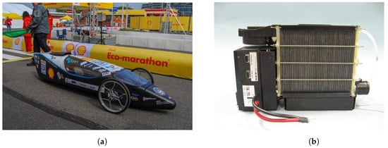 The NTHS was tested and optimized in HySy-Lab laboratory and afterwards implemented on the vehicle prototype IDRA [,] that participated at the Shell Eco-Marathon competition [] (Rotterdam-May 2015) achieving good results in terms of consumption. IDRA [,,] (Figure 6a) is a carbon-fiber monocoque prototype [,] of 38 kg, 3 m length, 0.6 m height and 0.95 m width. The FCEV has a 200 W brushed electric motor and a 1 kW [] closed cathode FC (Figure 6b) supplied, through a pressure reducer, by a 0.4 L at 200 bar hydrogen cylinder.
