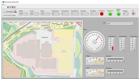To control in real time and save all the parameters of the system on the vehicle prototype, IDRA are implemented on two boards: a telemetry system and a datalogger. The telemetry (Figure 8) allows all the parameters controlled by the boards to be display in real time, during the SEM competition, and to be analyzed afterwards. Namely they are: