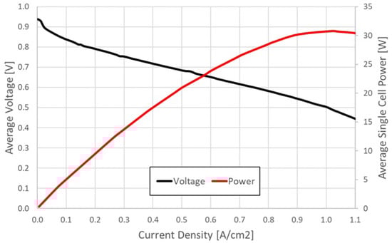 After that, the polarization and power curves of the FC were obtained by experimental laboratory tests [] and are shown in Figure 10.