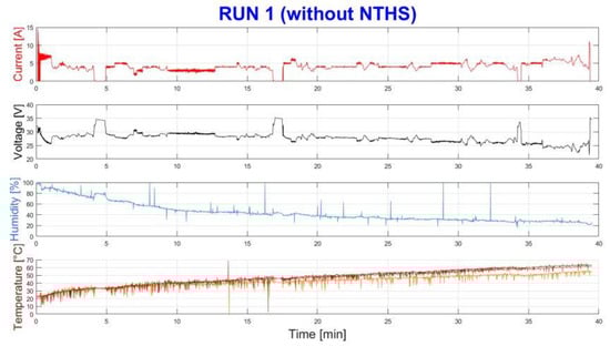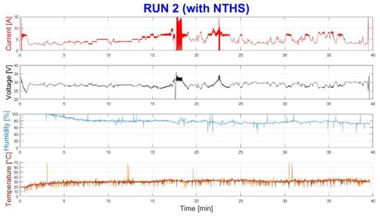 In Run 1, without NTHS, reported in Figure 11, the current request is about 5 A and it is more or less constant during the entire run. It is possible to note that the voltage begins to decrease after 15 min, and even though the power request (therefore current request) trend is constant, it continues to decrease from 30 V at the start to 24 V at the end of the run.
