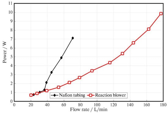 where: is the mass flow rate (Nafion® tubing blower + reaction blower flow rate), n is the number of cells stack (40 cells in our case), and I the fuel cell current request [,].