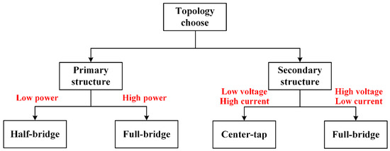 The primary and secondary sides of different architectures are discussed in this section. Because different circuit specifications have their appropriate architecture, the architecture is chosen based on power level and component stress, as shown in Figure 1. The primary side may consist of a half bridge or full bridge, whereas the secondary side comprises a center-tap and full-bridge rectification. The choice of different architectures for the primary side results in different transformer designs; hence, the primary side is mainly selected based on the corresponding architecture for the appropriate power level. As for the different architectures on the secondary side, there are different component stresses and numbers of switches. Therefore, the appropriate architecture for the secondary side is mainly selected according to the level of the output voltage and current.