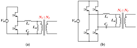 The common structures for the primary side are the half bridge and full bridge (Figure 2). For the half bridge, the voltage across the resonant tank is +Vin to 0 V; however, the actual voltage across the transformer is ±Vin/2. Therefore, the turns ratio between the primary and secondary sides must be accounted for when designing the transformer. The energy transfer formula in Equation (1) can be rewritten as a general formula that establishes ZVS under a half-bridge structure, as shown in Equation (2).