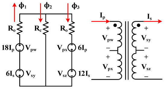 Figure 5 presents the concept of adjustable leakage inductance, where the voltage of the primary side and secondary side are denoted by Vp and Vs, respectively. The winding in the primary side was divided into two parts, of which one part wound counterclockwise with 18 turns around the left outer leg, and the other wound clockwise with 6 turns around the right outer leg. Similarly, the winding on the secondary side was also divided into two parts, in which one part wound clockwise with 6 turns around the left outer leg, and the other wound counterclockwise with 12 turns around the right outer leg. Moreover, according to Equation (6), the magnetomotive force (MMF) of these windings could be represented as 18 Ip, 6 Is, 6 Ip, and 12 Is, and their voltage as Vpw, Vpx, Vsy, and Vsz, respectively. Ro represents the reluctance of the outer leg, and Rc represents the reluctance of the center leg.